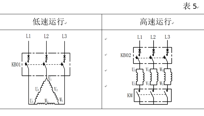 許多場合需要使用雙速電動機如一般工業建筑、民用建筑、排風兼排煙風機。通常需要兩種風機轉速分別用于正常(平時低速排風)和緊急情況(如發生火災需要高速排煙),為此需要采用雙速控制器去控制兩種轉速的電動機?;趦膳_KB0輔以適當的接觸器等構成KB0D雙速控制器裝置,其控制雙速電動機繞組的接線方式見表5。